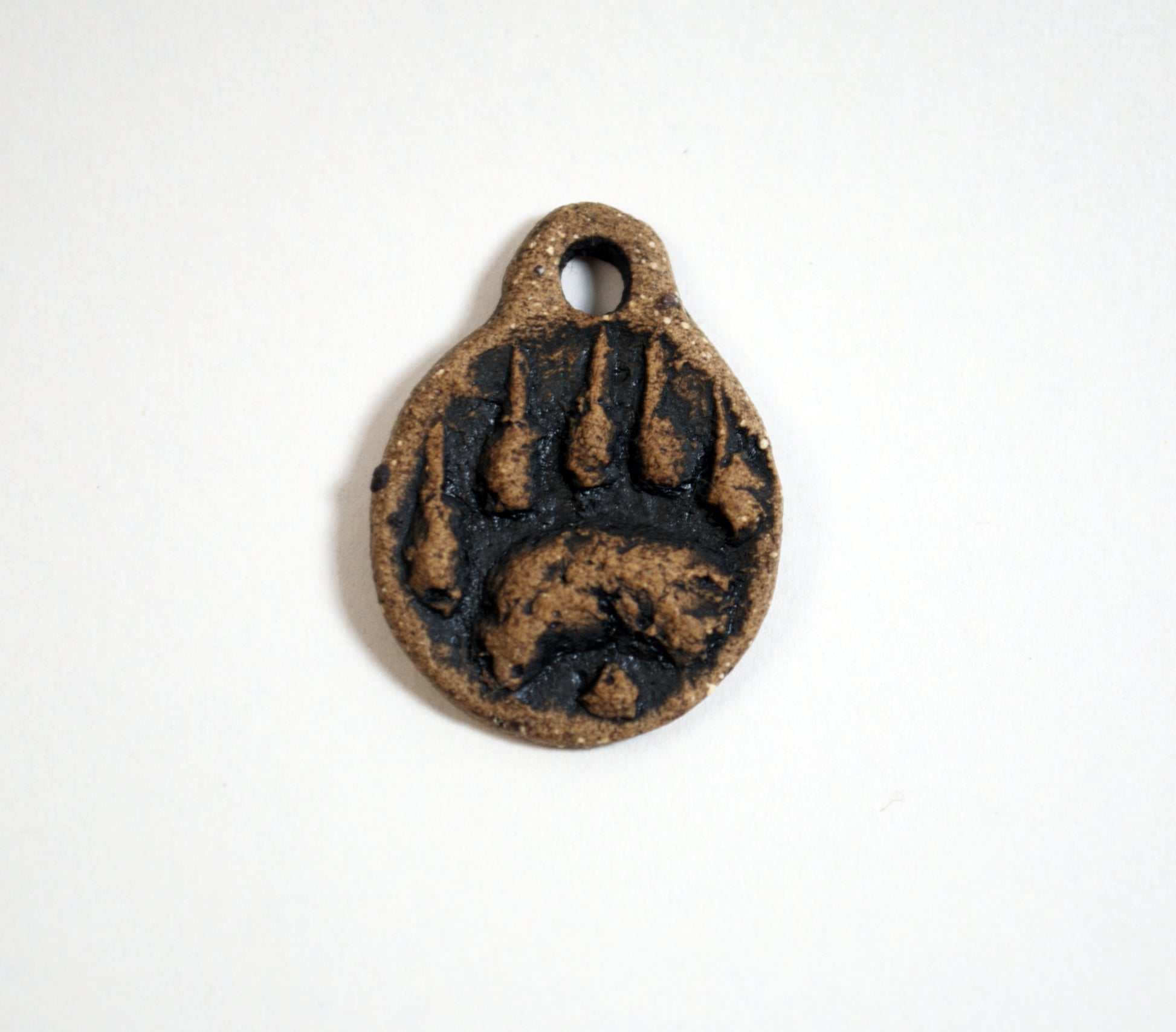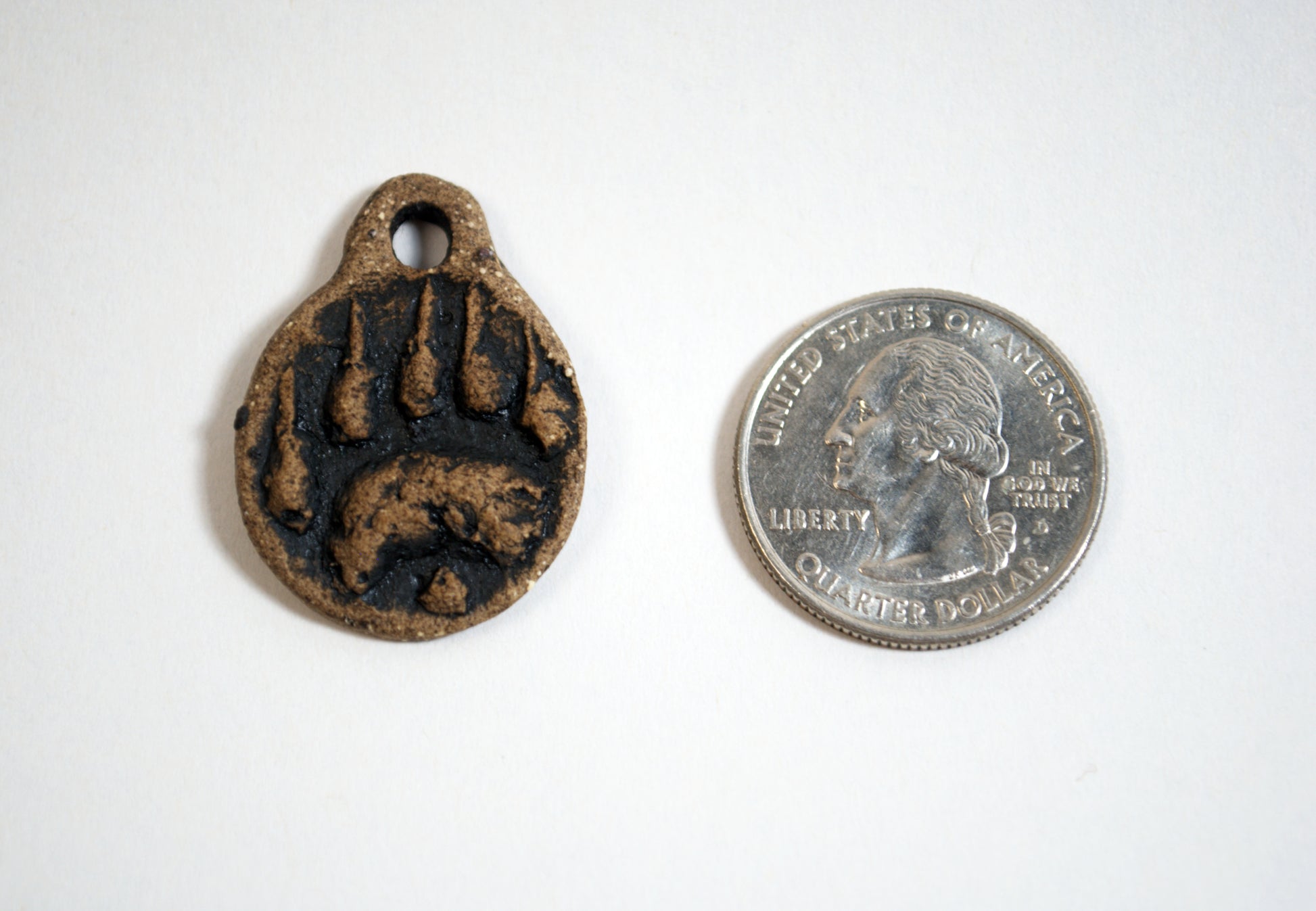 Made with a carved cork stamp, this stoneware pendant is perfect for any bear lover. This pendant was fired to cone 6 and given a black underglaze wash to make the track pop. That's it! Made of tough stoneware, the clay has both the look of real stone and its hardiness.