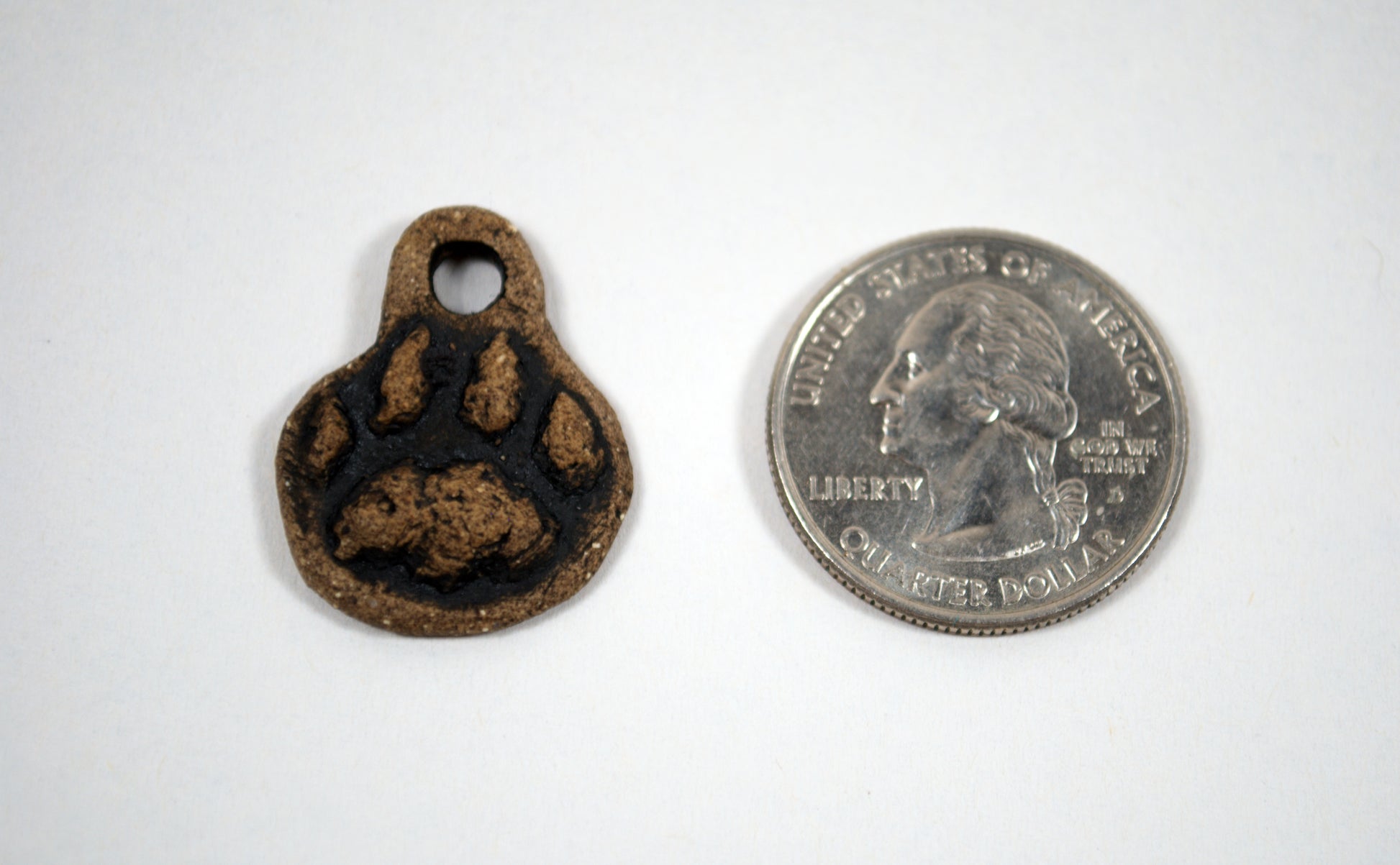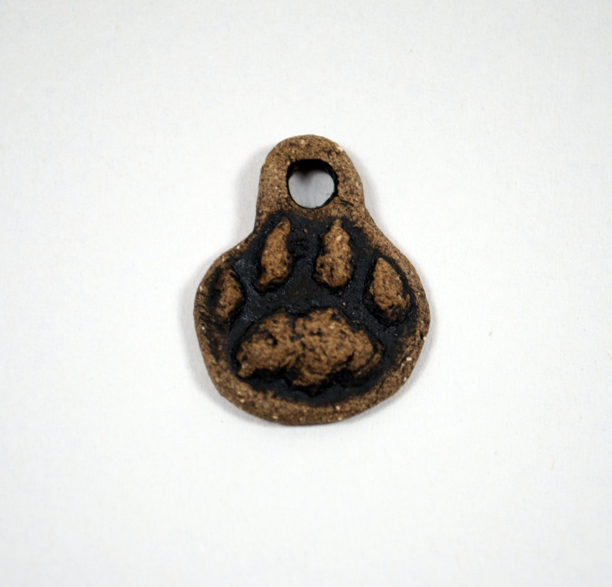 Made with a carved cork stamp, this stoneware pendant is perfect for any feline fan. This pendant was fired to cone 6 and given a black underglaze wash to make the track pop. That's it! Made of tough stoneware, the clay has both the look of real stone and its hardiness.