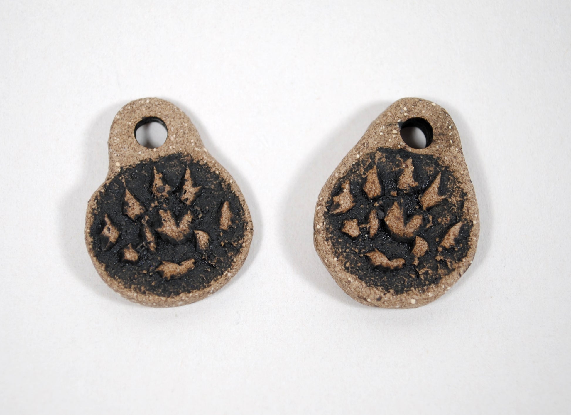 Made with a carved cork stamp, this stoneware pendant is perfect for any otter lover. This pendant was fired to cone 6 and given a black underglaze wash to make the track pop. That's it! Made of tough stoneware, the clay has both the look of real stone and its hardiness.