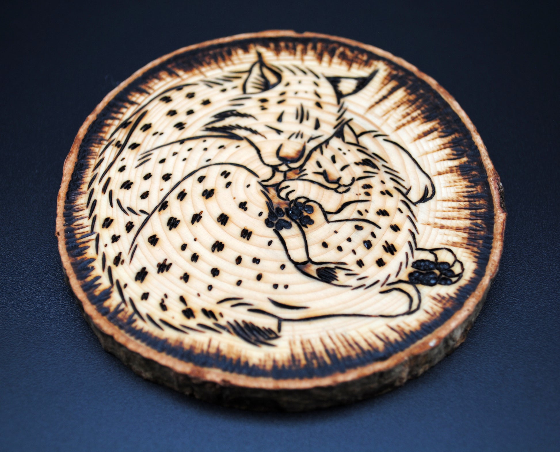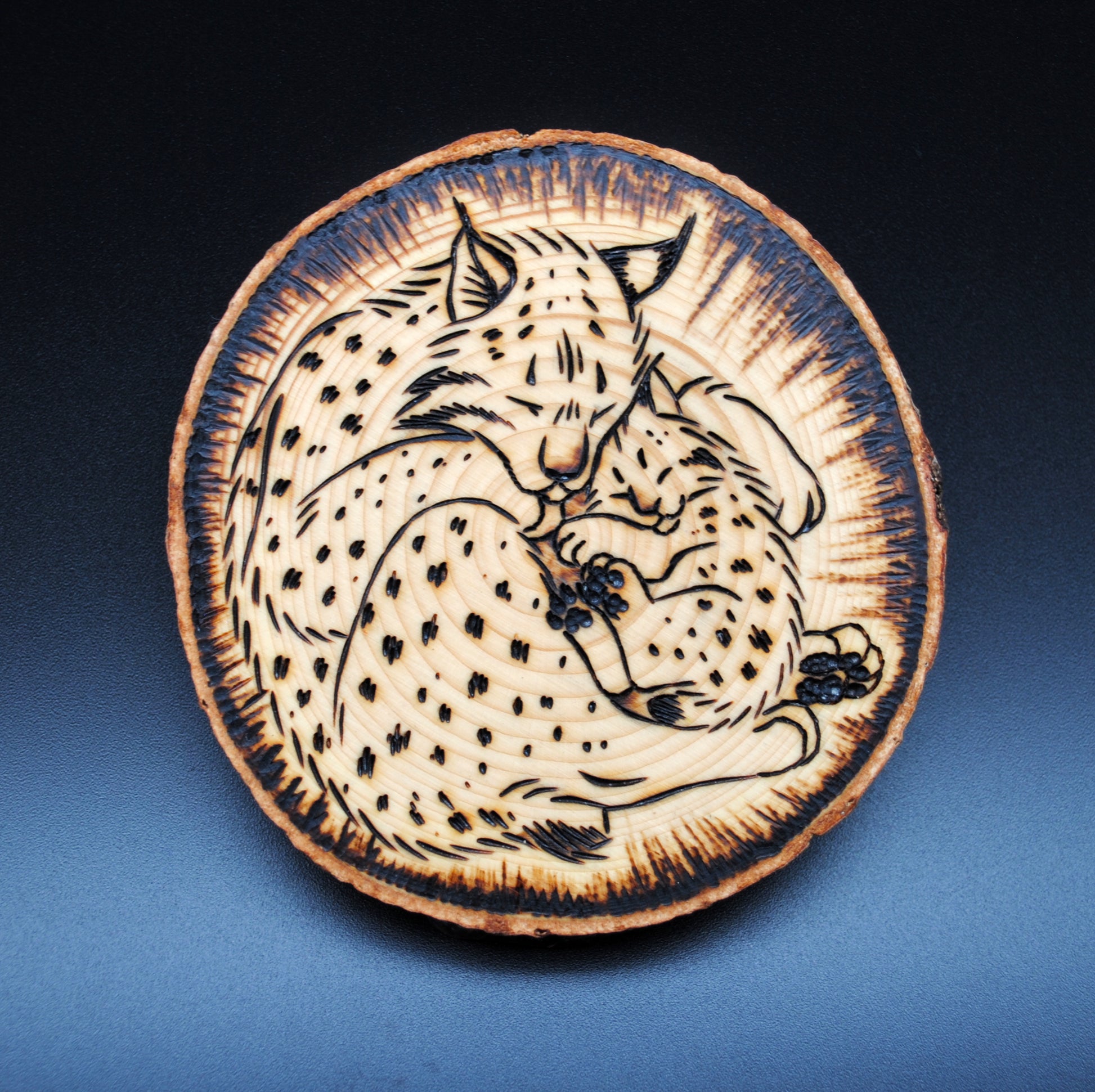 This piece of live edge pine has a one of a kind woodburned illustration of a bobcat sleeping with their kitten.