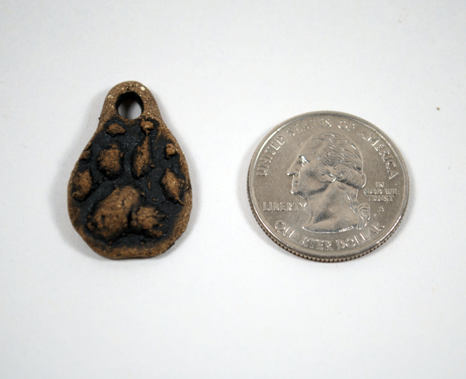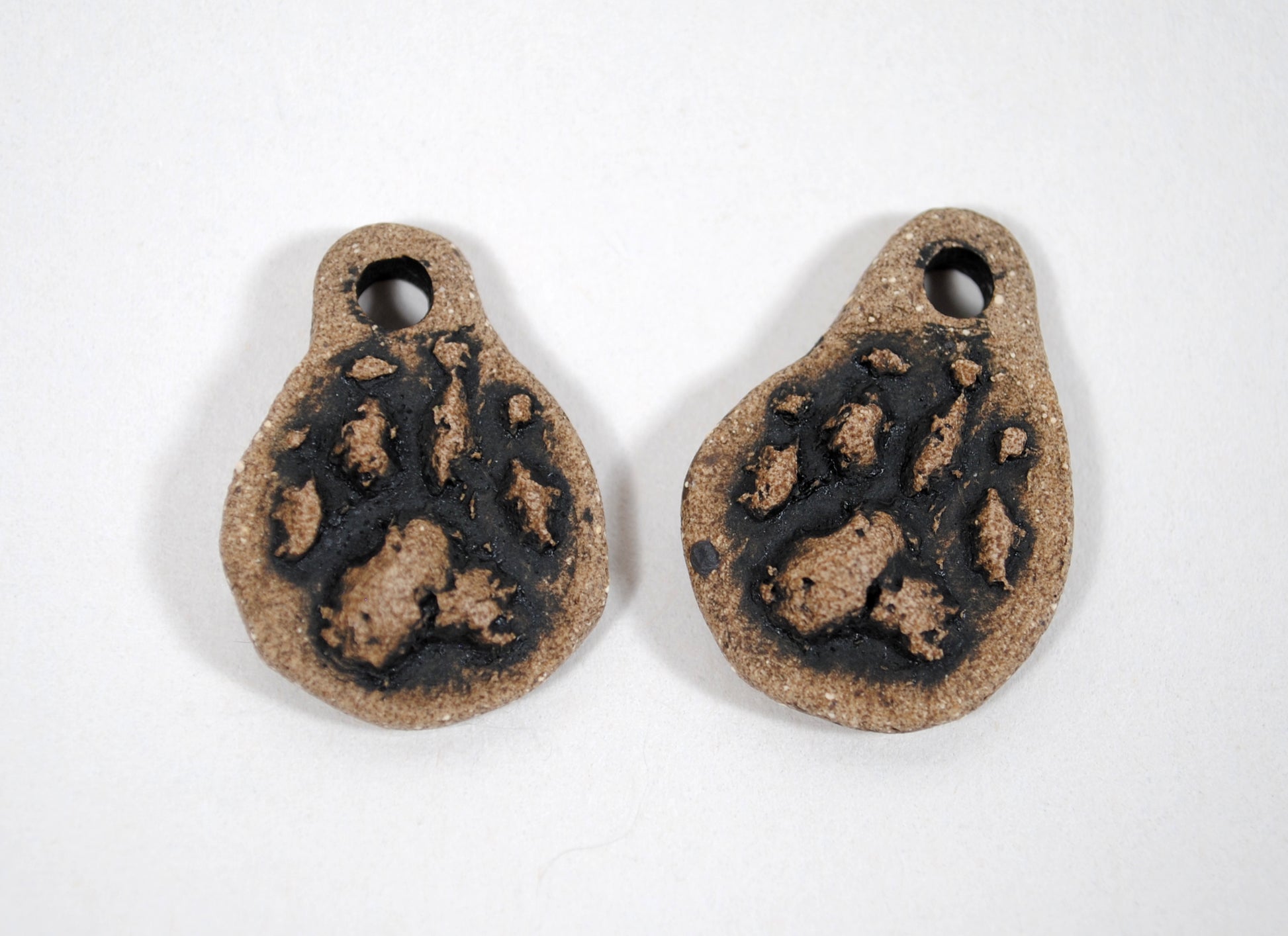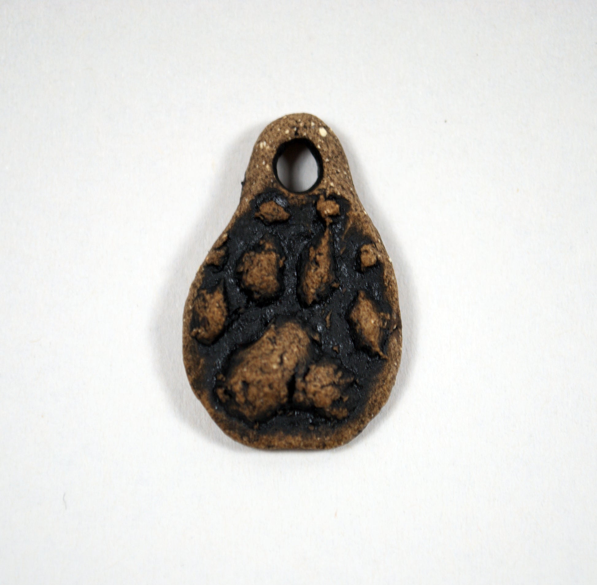 Made with a carved cork stamp, this stoneware pendant is perfect for any canine lover. This pendant was fired to cone 6 and given a black underglaze wash to make the track pop. That's it! Made of tough stoneware, the clay has both the look of real stone and its hardiness.