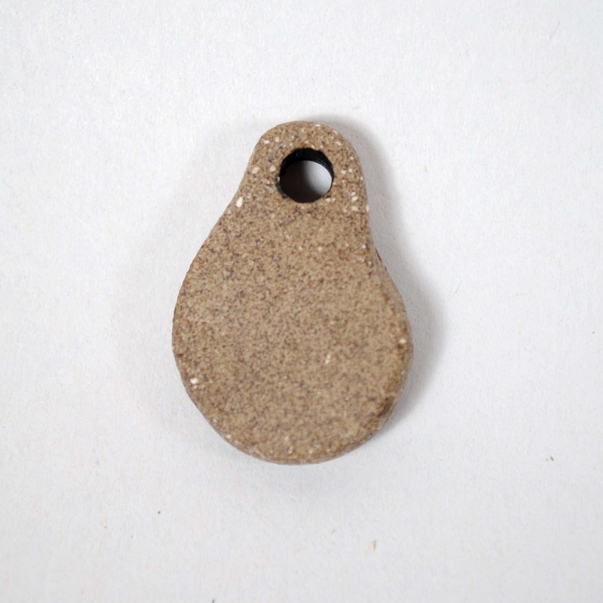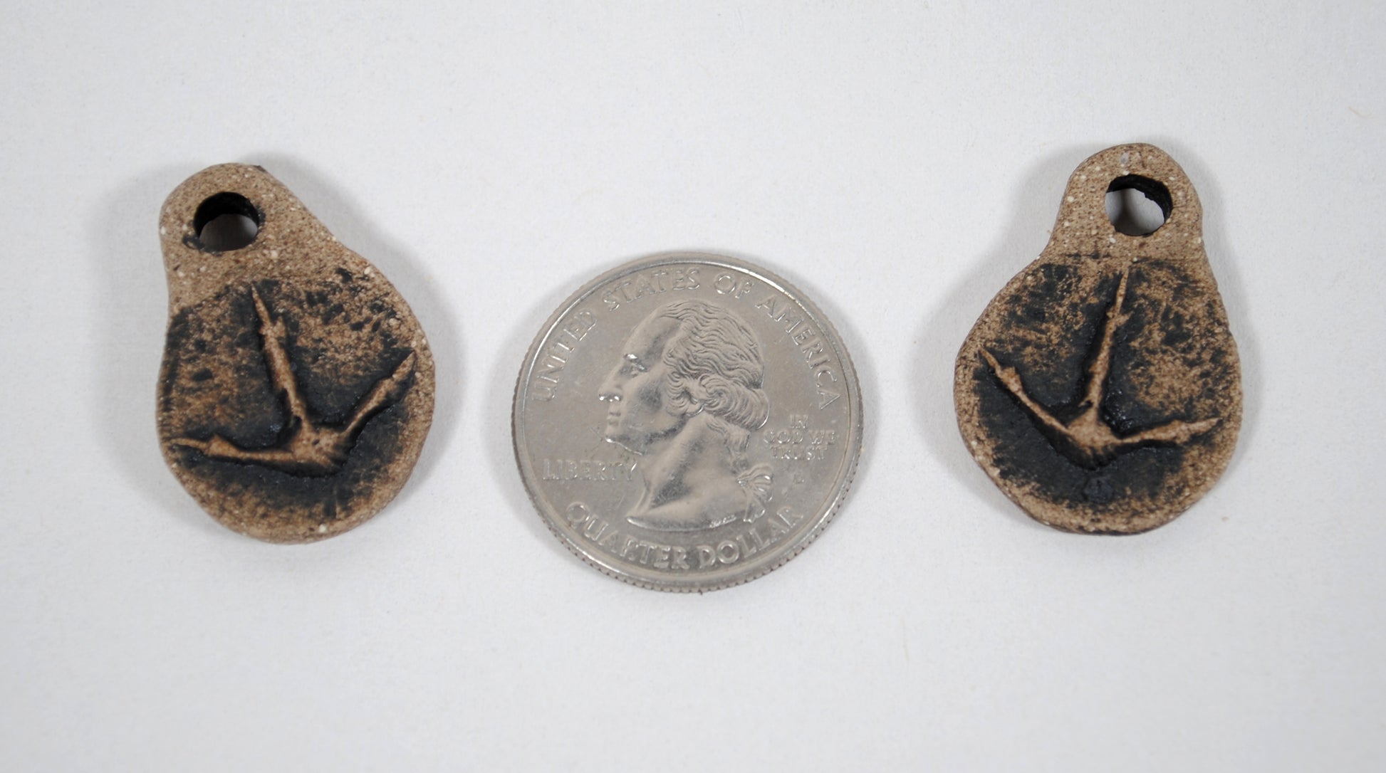 Made with a carved cork stamp, this stoneware pendant is perfect for any turkey lover. This pendant was fired to cone 6 and given a black underglaze wash to make the track pop. That's it! Made of tough stoneware, the clay has both the look of real stone and its hardiness.