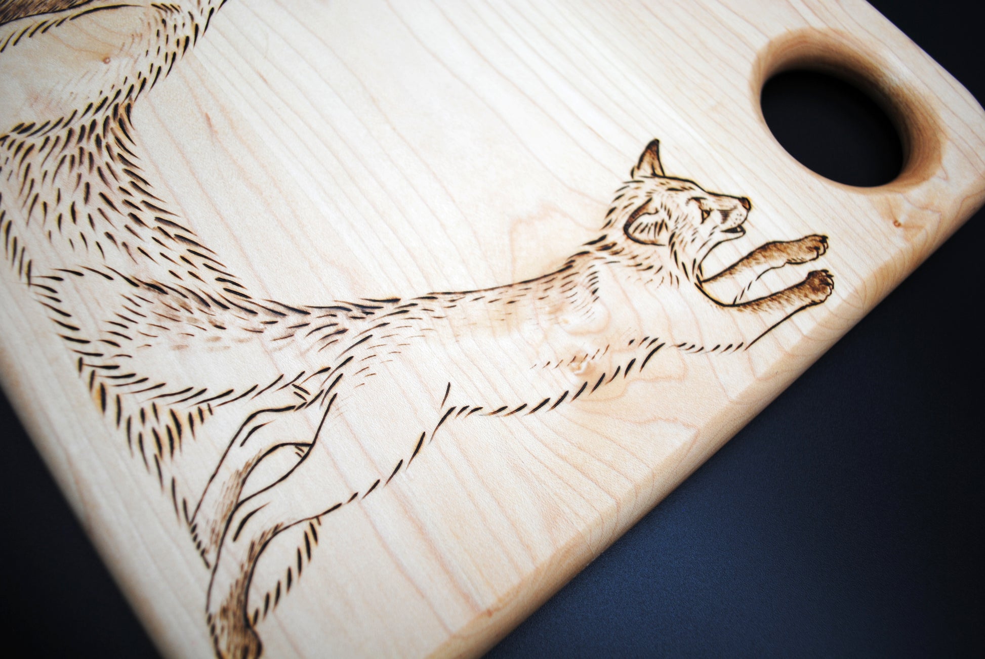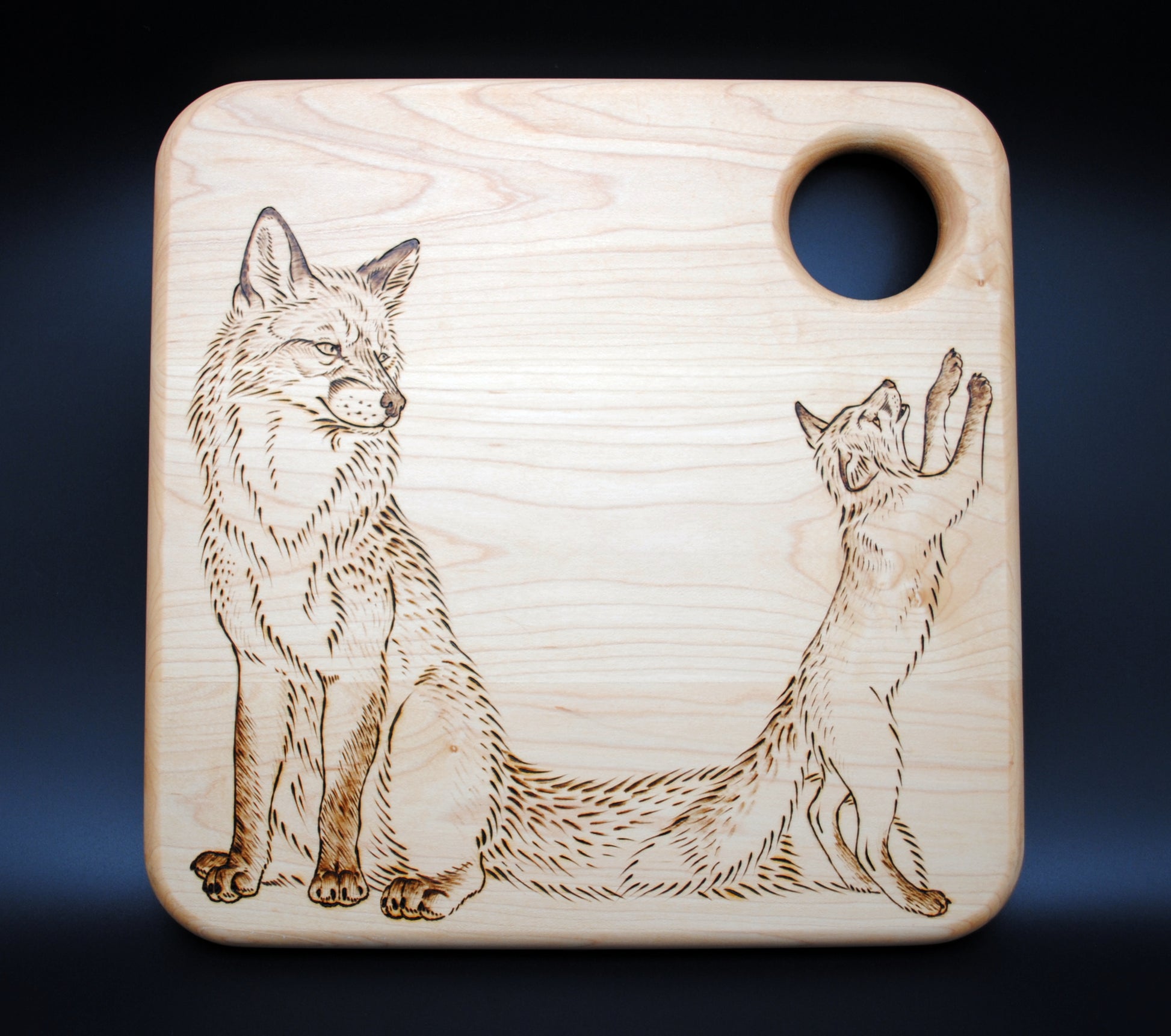 This hand-burned hard maple cutting board features an adorable image of a mother red fox watching her kit play. As the design covers the majority of one side of the board, I recommend using the blank side for cutting and the burned side for charcuterie or display.