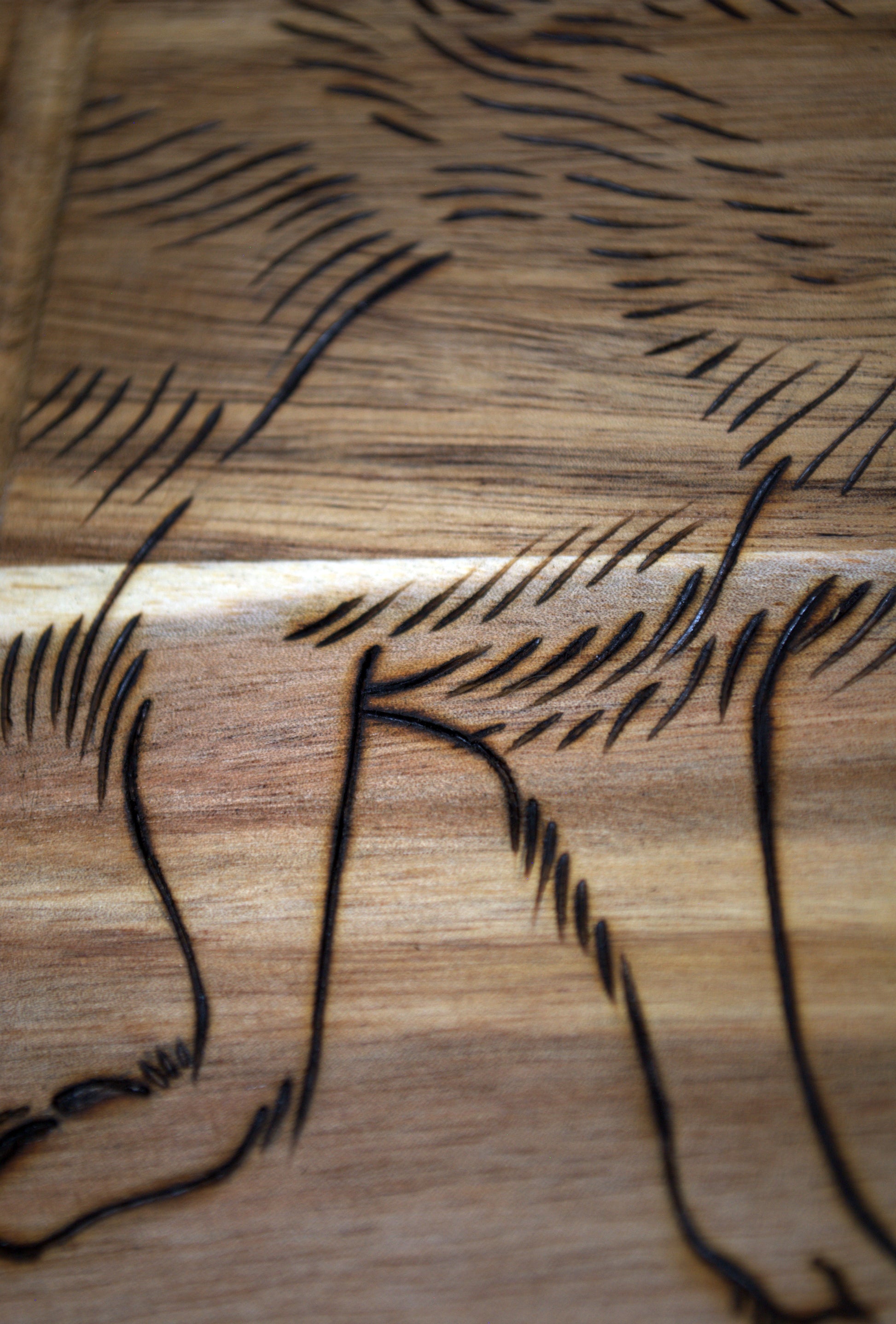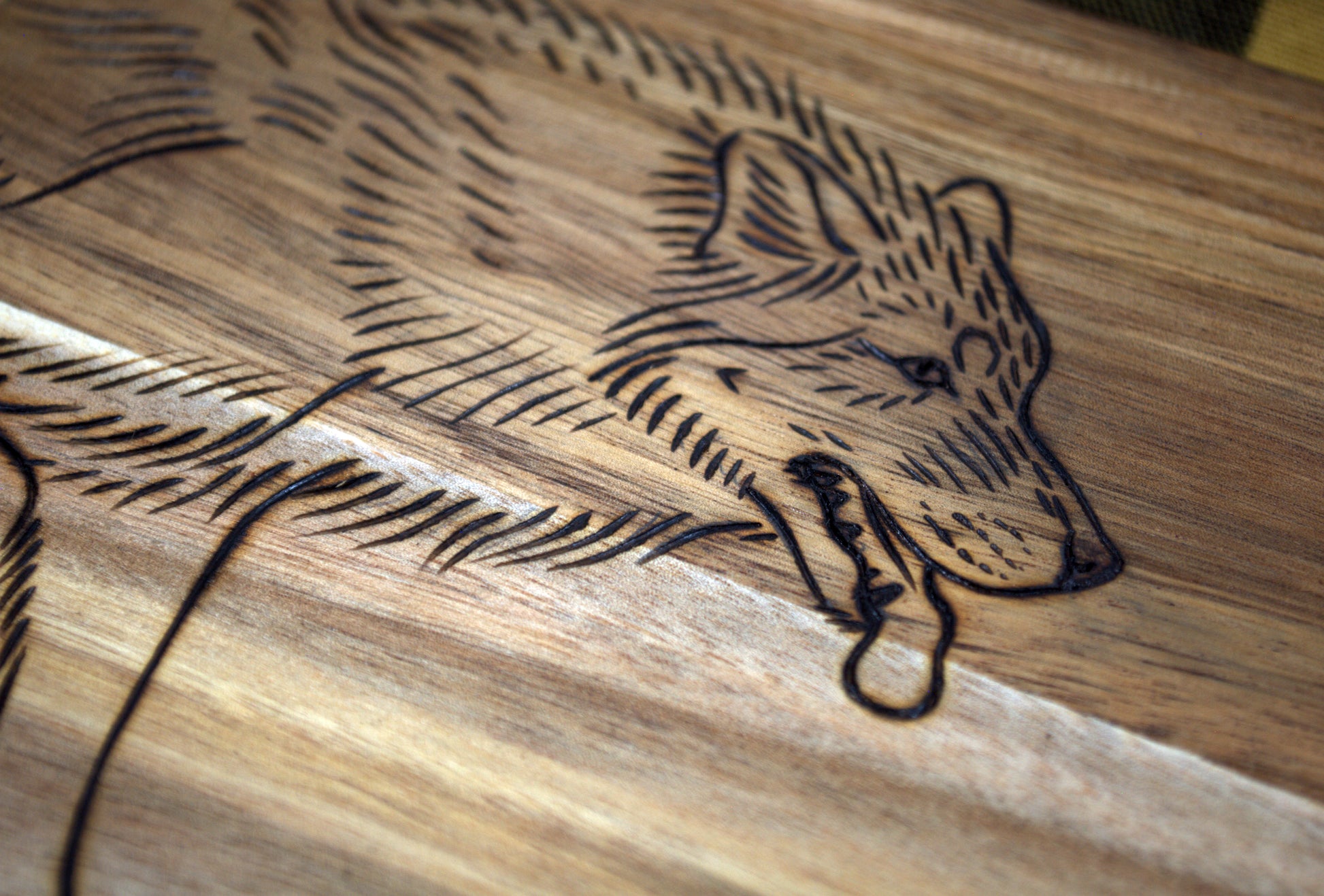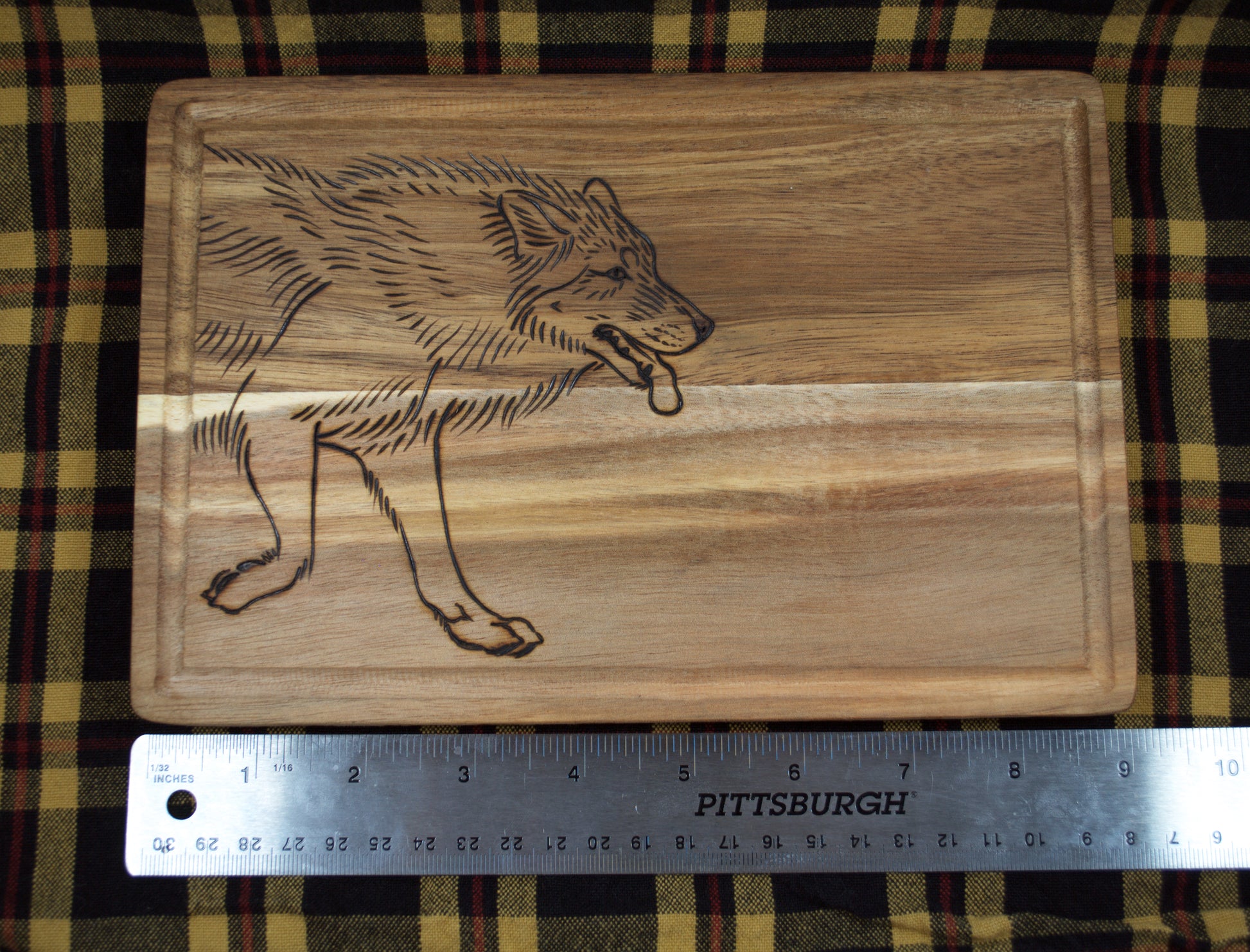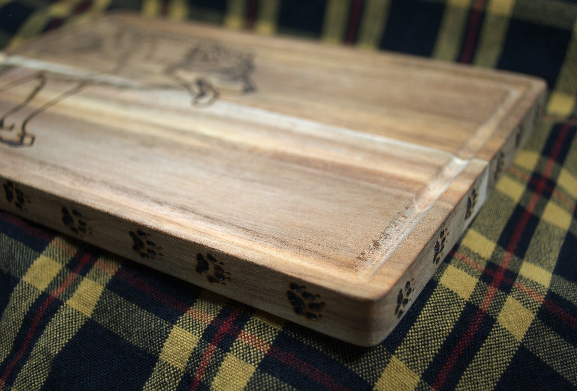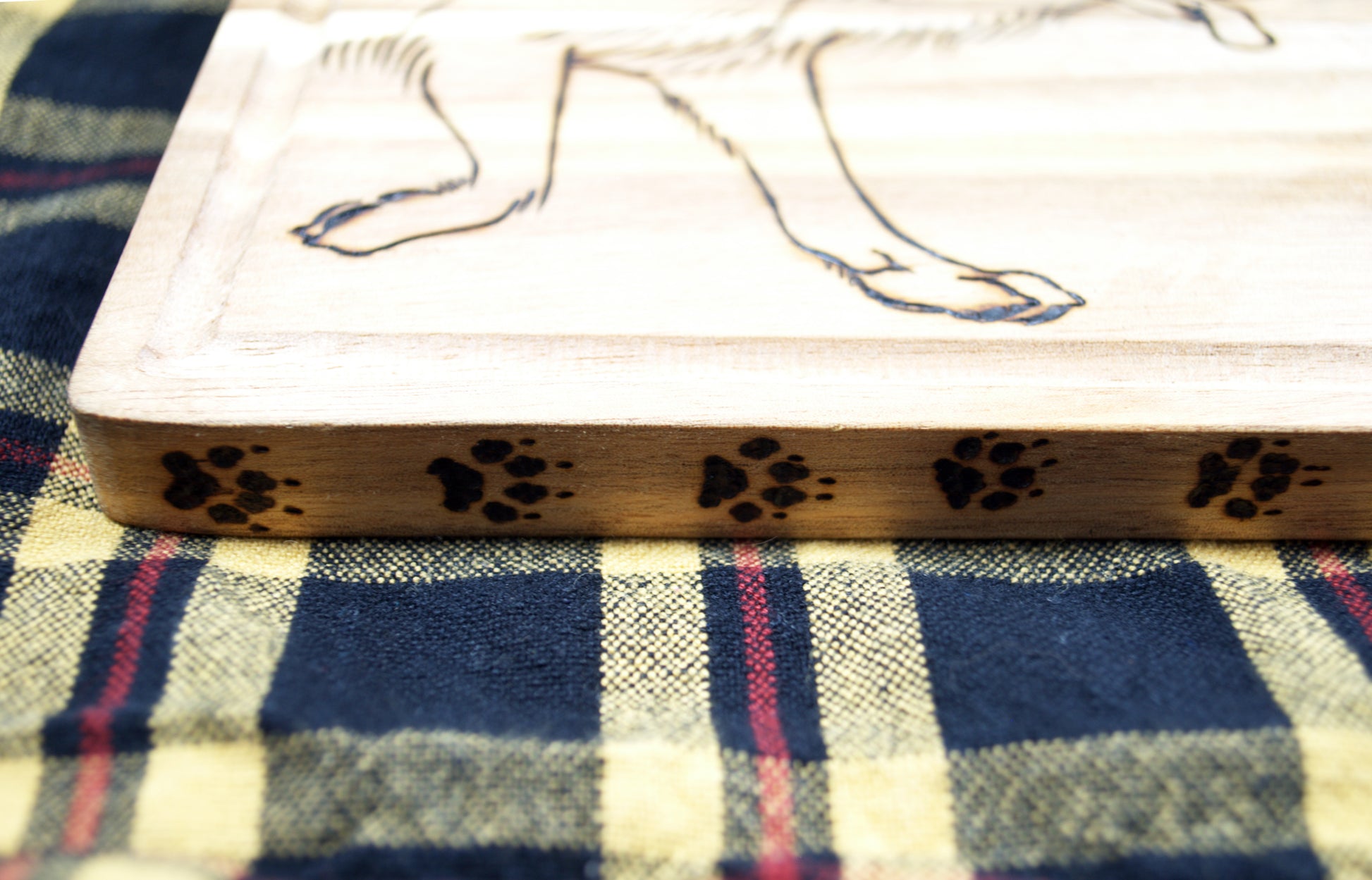 Perfect for any carnivorous charcuterie, this small cutting board has been burned by hand with the image of a hunting wolf and a trail of wolf paw prints around the border.