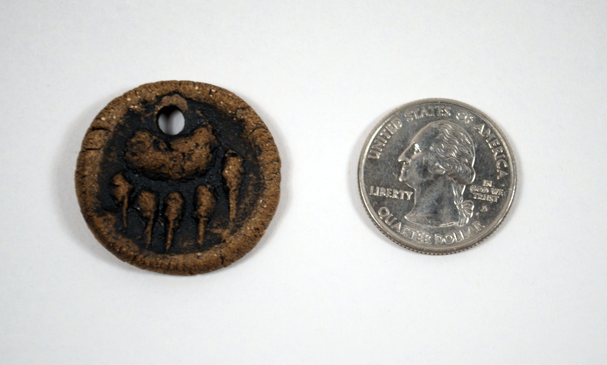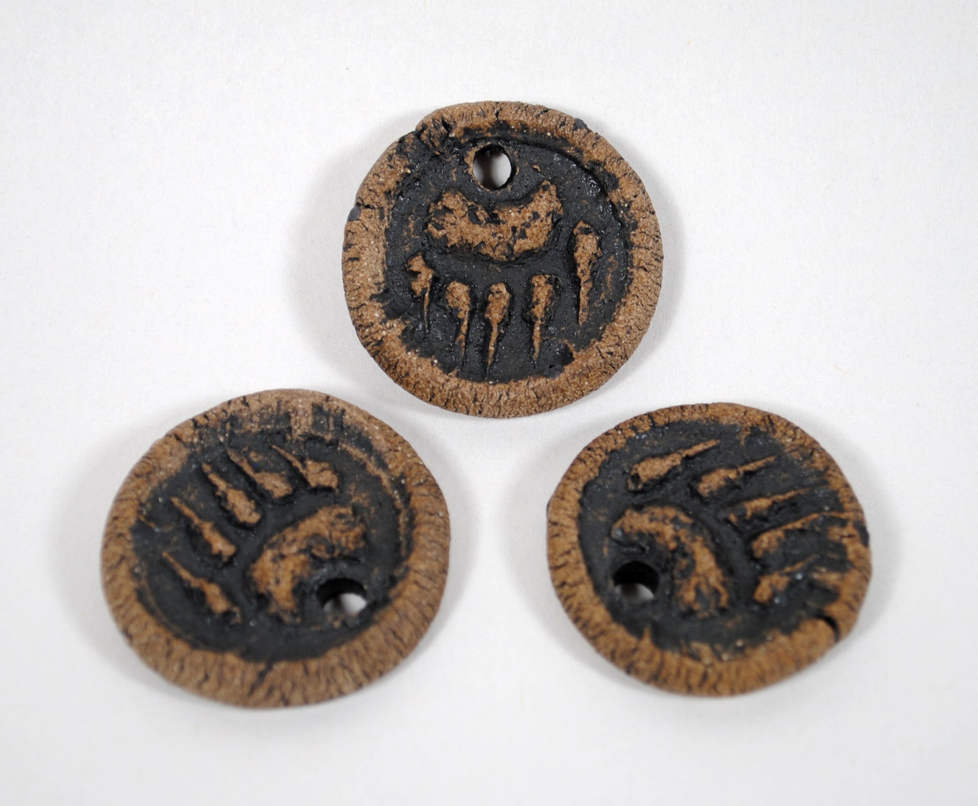 Made with a carved cork stamp, this stoneware pendant is perfect for any bear lover. This pendant was fired to cone 6 and given a black underglaze wash to make the track pop. That's it! Made of tough stoneware, the clay has both the look of real stone and its hardiness.