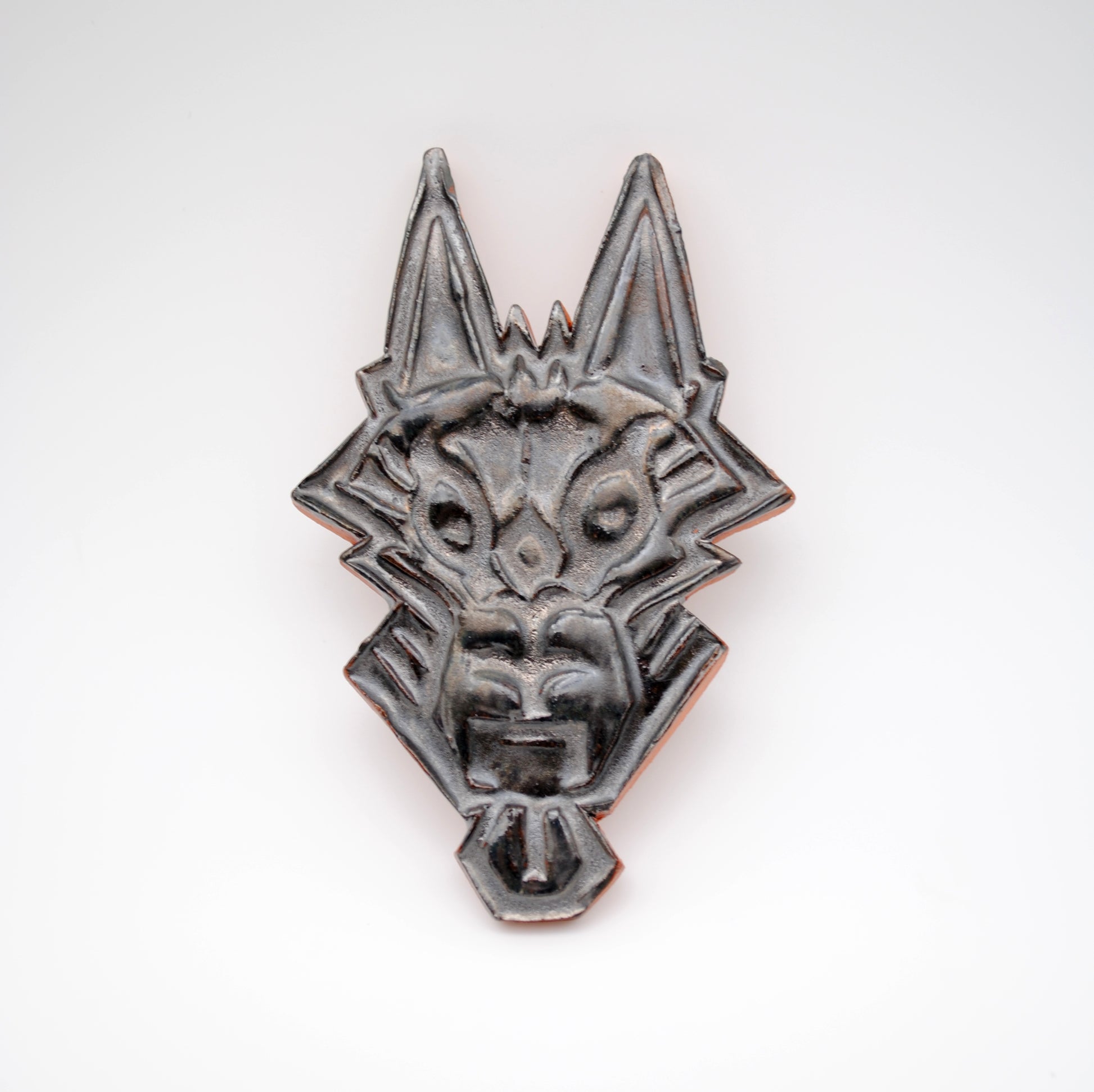 Wall tile made of terracotta clay with a striking metallic glaze that shifts in different lighting. Made by pressing clay with a carved linoleum tile.