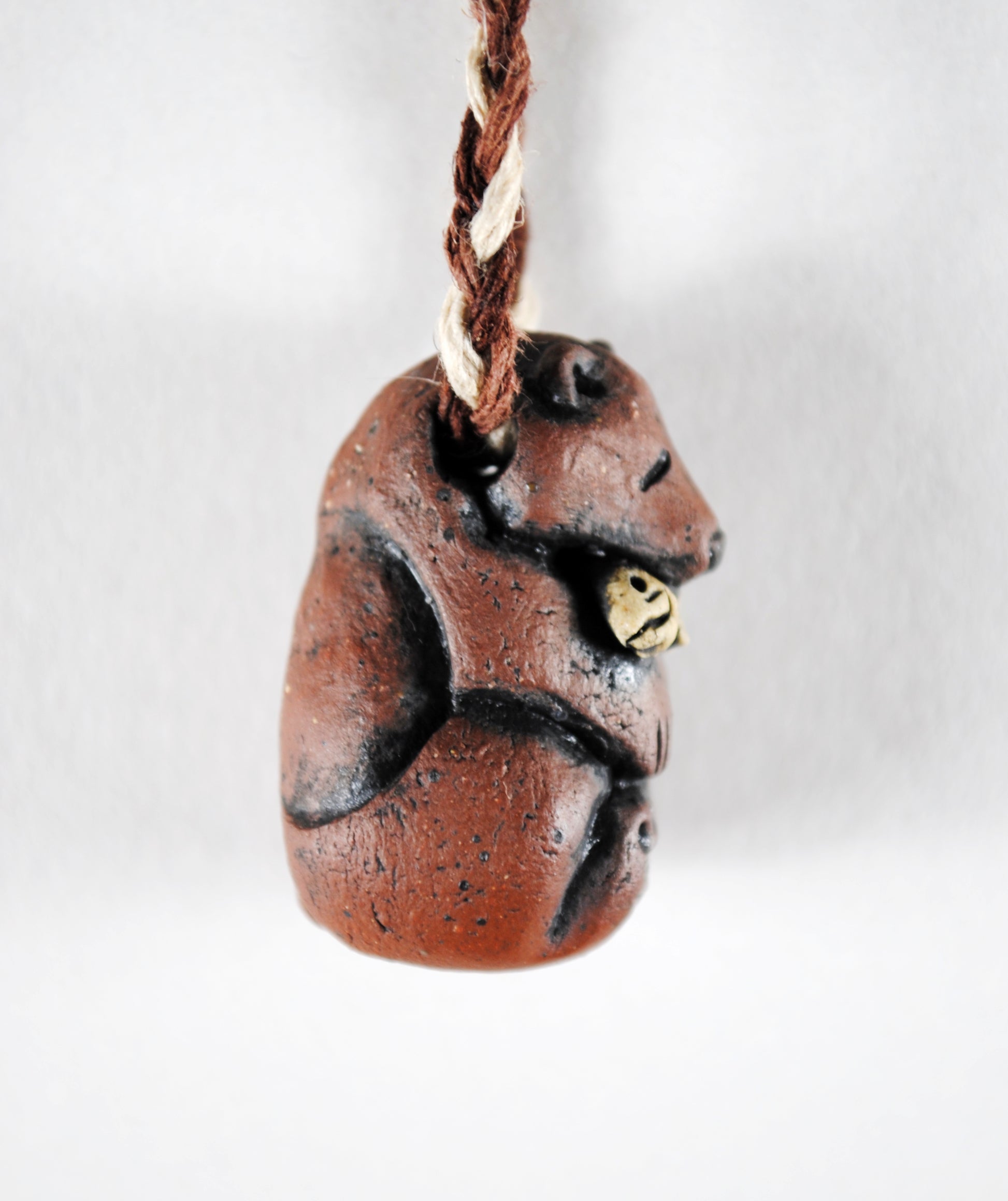 Hand sculpted and one of a kind, this bear pendant is perfect for any ursid lover. Sculpted from red earthenware and white stoneware clay, then fired to cone 6 after a black underglaze wash.