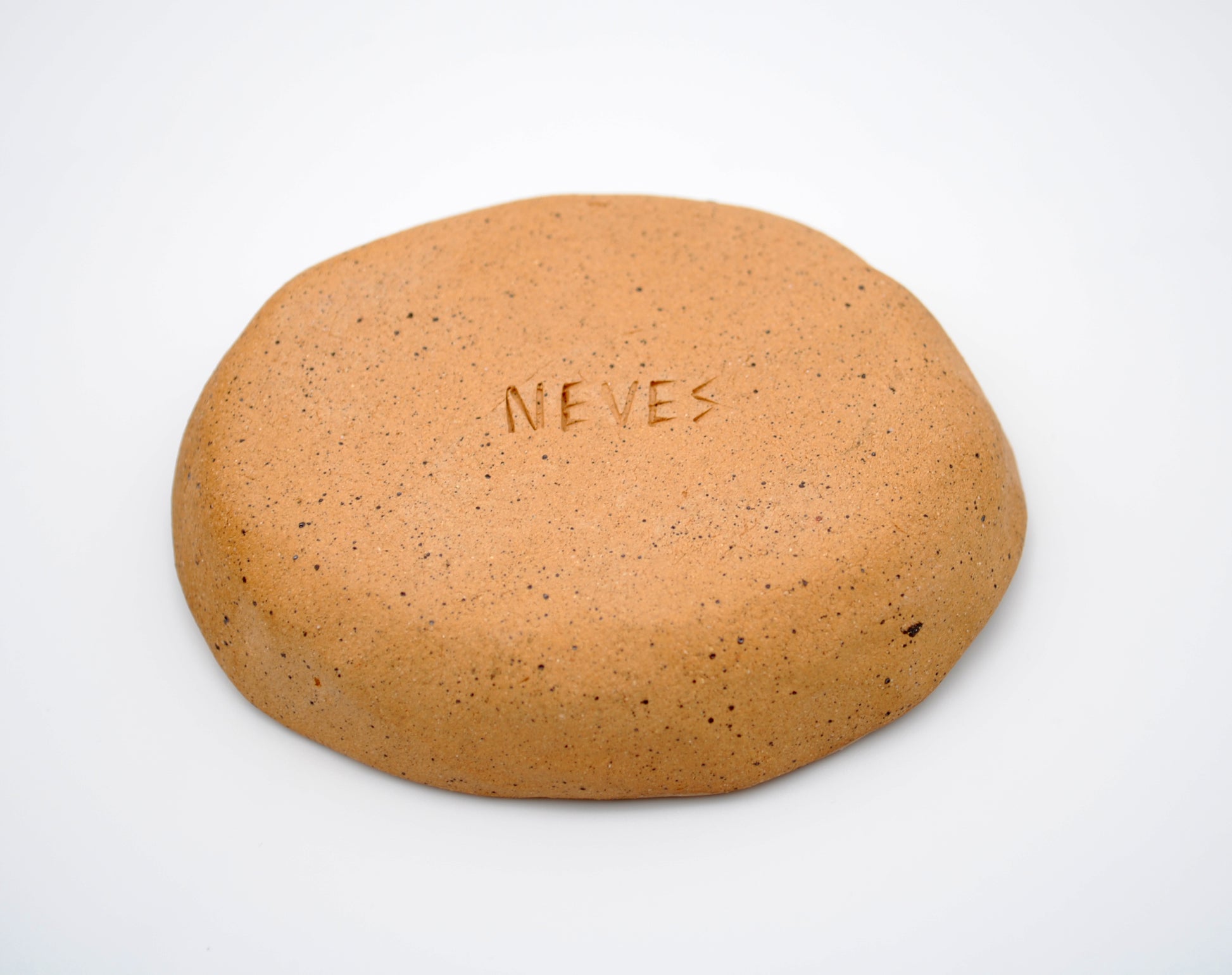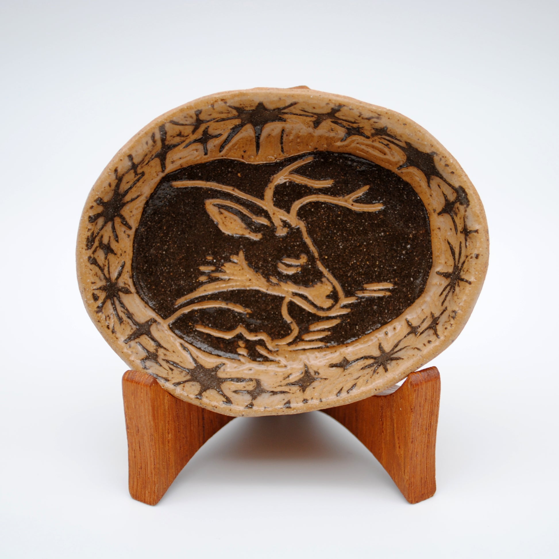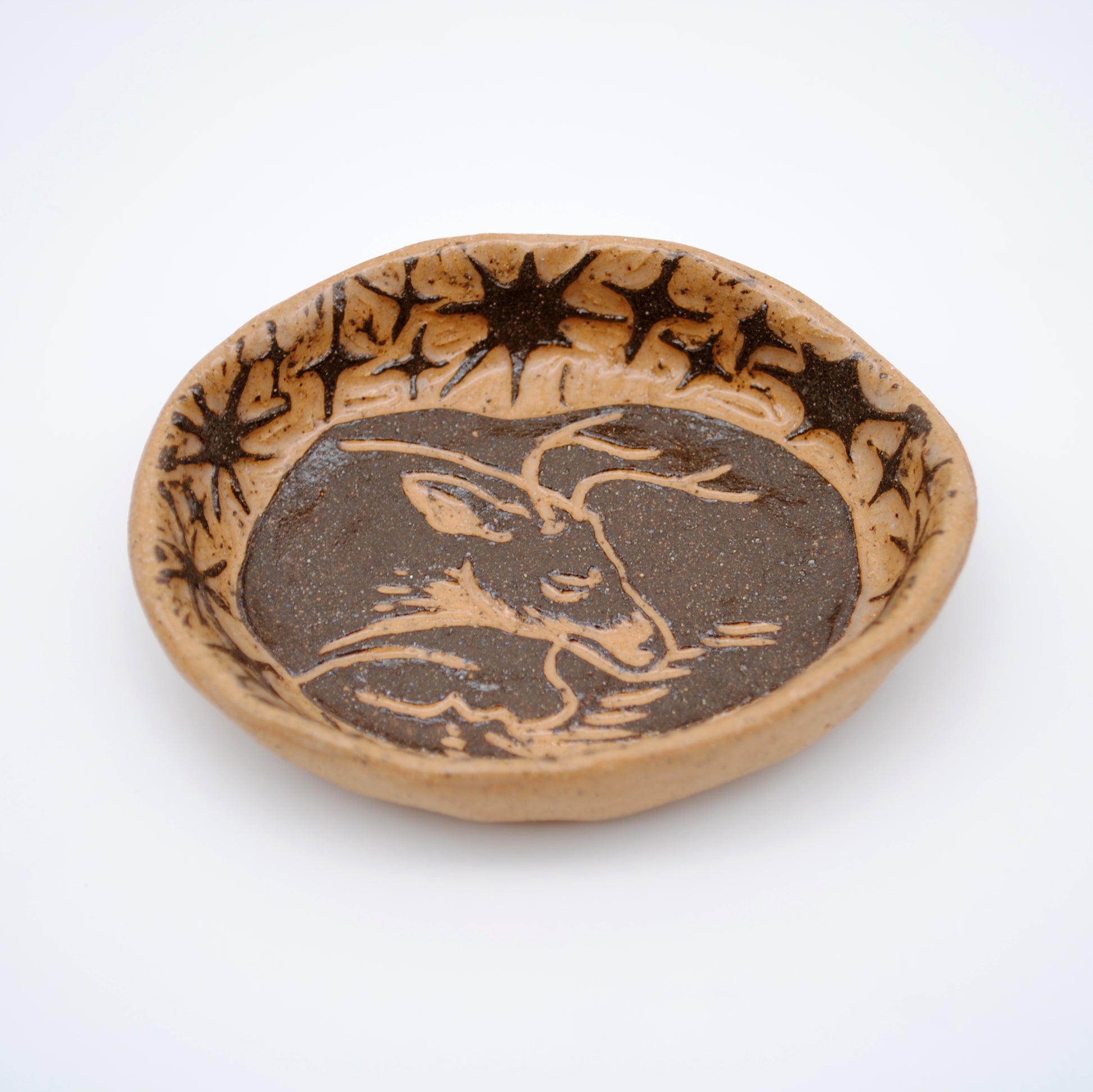 This small trinket dish is made of speckled stoneware clay, with black slip that was carved by hand to reveal the image of a whitetail deer sleeping peacefully with stars surrounding him.