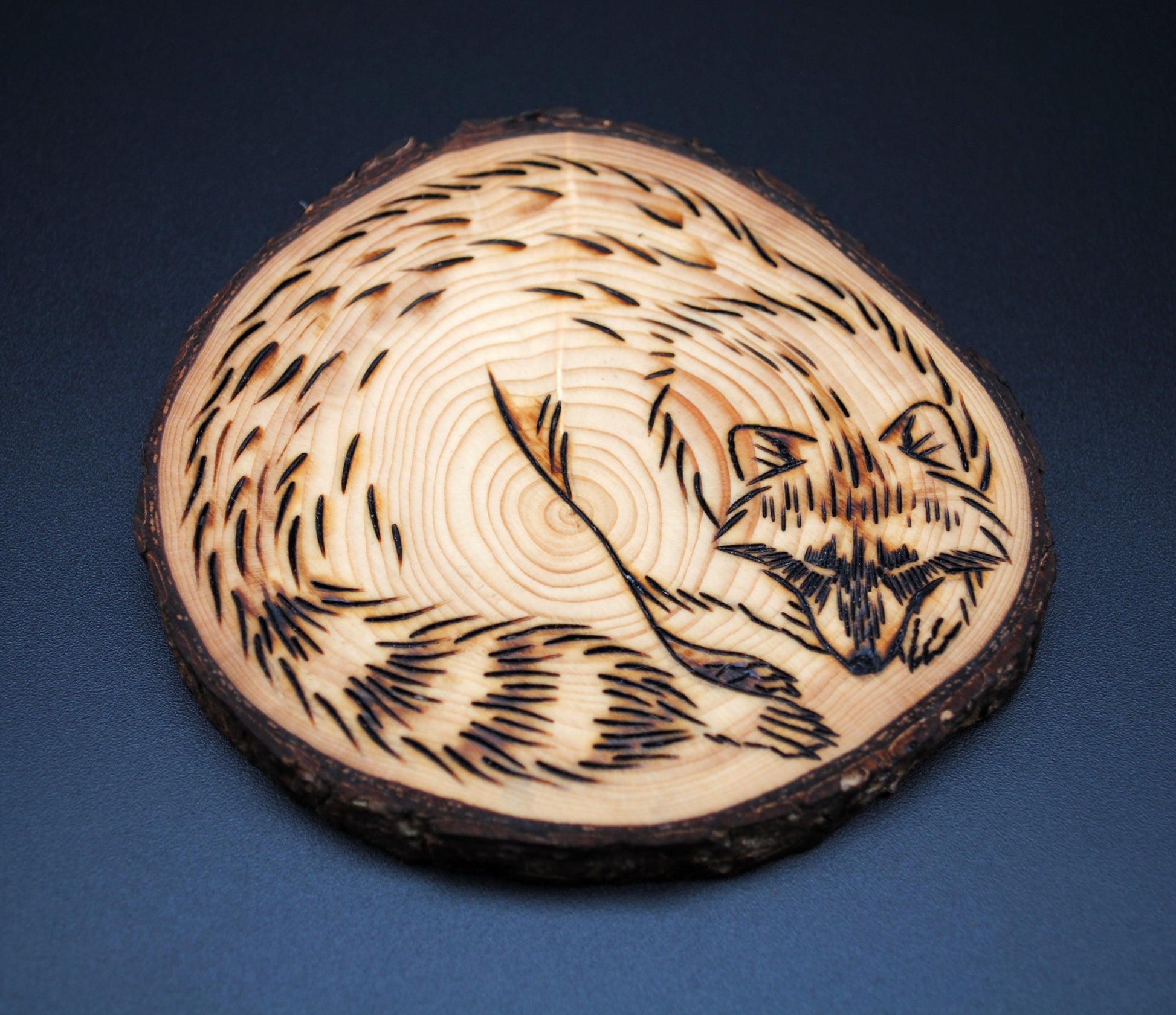 This piece of live edge pine has a one of a kind woodburned illustration of a peacefully sleeping raccoon.