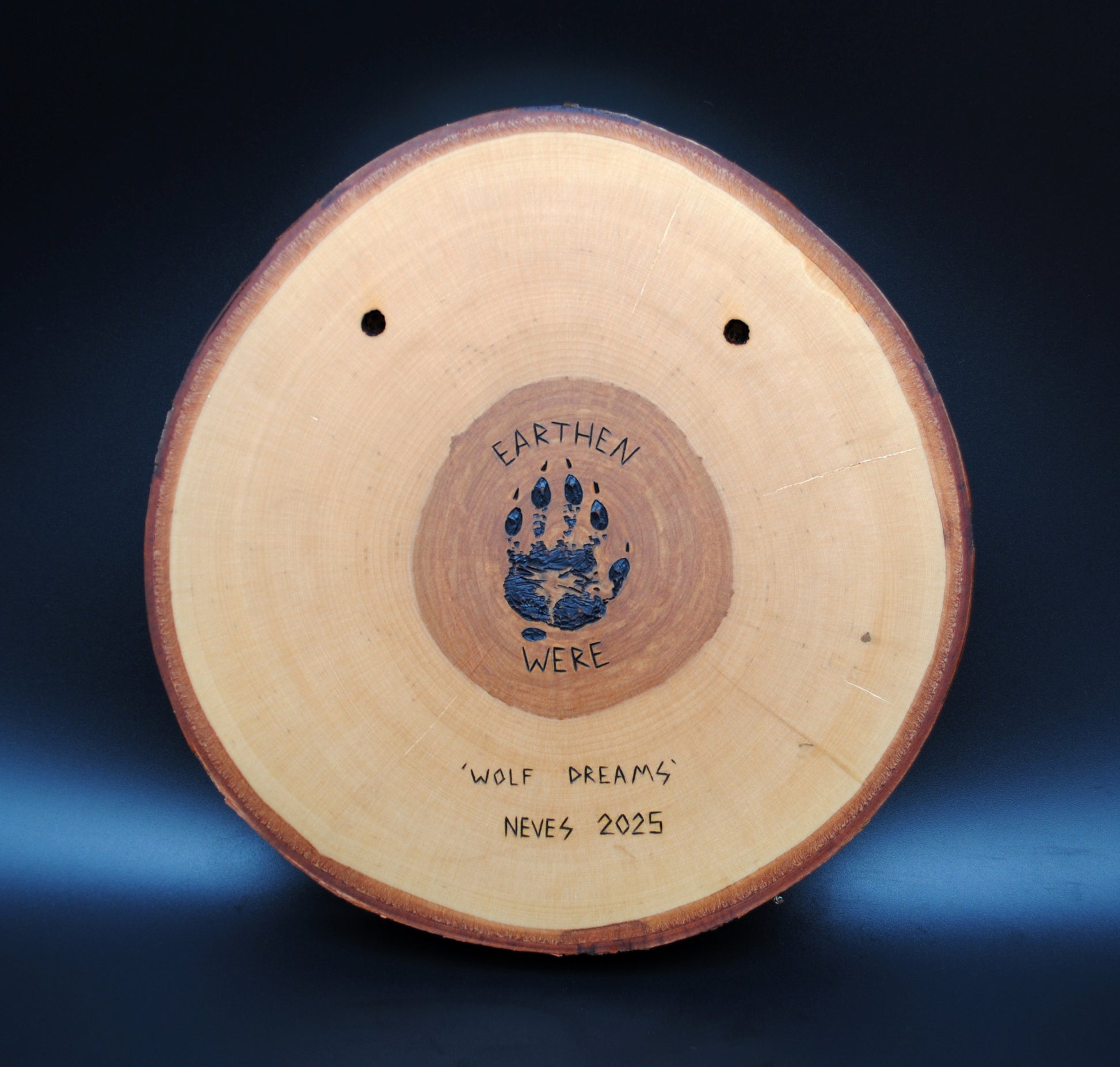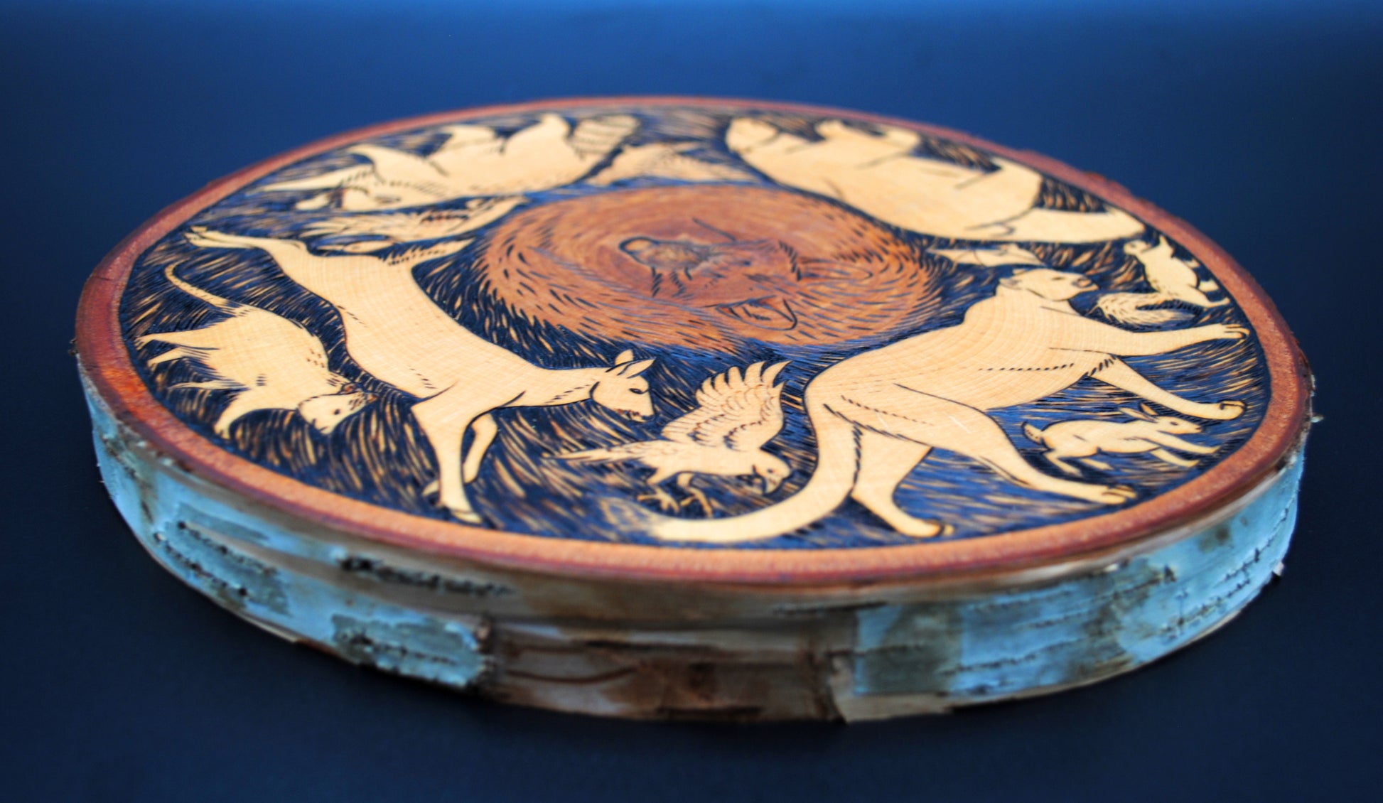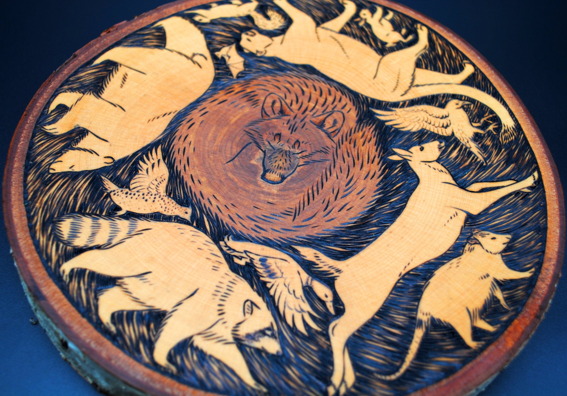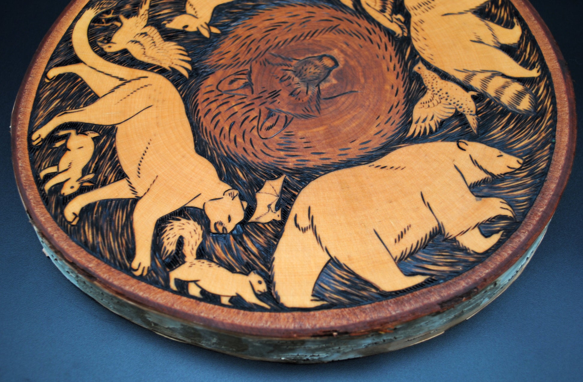 This beautiful piece of live edge birch has a one of a kind woodburned illustration of a sleeping wolf surrounded by running animals that include a black bear, raccoon, mountain lion, whitetail deer, opossum, squirrel, cottontail rabbit, mallard duck, raven, grouse, and a bat. There was no stain used in this piece, the brown color of the wolf is purely the color of the heartwood!