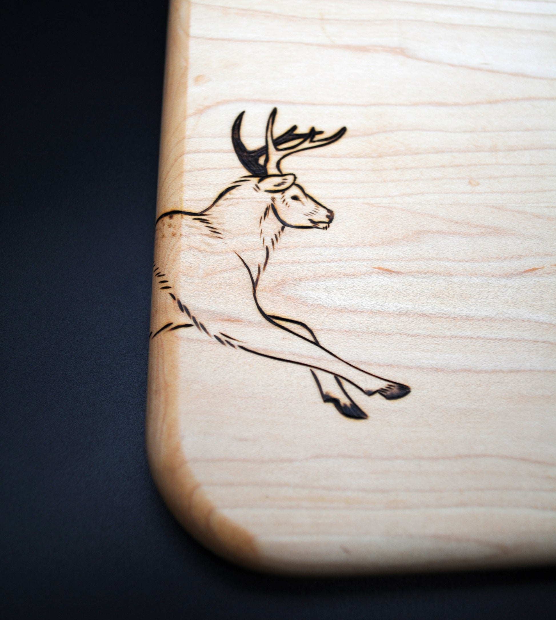 This hand-burned hard maple cutting board features imagery of a wolf pack hunting a fleeing whitetail deer, and three ravens in pursuit above. The last wolf and the deer both wrap around the edges of the board! Inspired by real life wolf hunts where wolves pursue animals with the aid of ravens.
